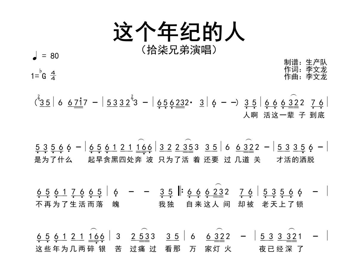 《这个年纪的人》是拾柒兄弟演唱的一首歌曲,原版简谱,拍号为4/4拍,歌曲速度为每分钟80拍,这份简谱共有一张高清图谱,图谱由 @生产队 编配上传拾柒兄弟演唱的民谣歌曲《这个年纪的人》原版简谱,完整的前奏、间奏、尾奏solo编配,值得推荐的一首民谣歌曲。