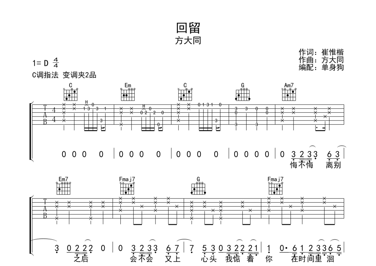 《回留》是方大同演唱的一首歌曲,拍号为4/4拍,歌曲原调为D调,但由于原调指法比较难,为了方便弹奏,本吉他谱采用的是C调指法编配,变调夹2品弹奏即为原调,当然也可以根据自己的音域改变变调夹位置,或者通过改变和弦调性,以方便自己弹奏,这份吉他谱共有三张高清图谱,图谱由 @单身狗 编配上传,图谱使用六线谱编配,包含吉他和弦指法、简谱以及歌词部分,使用这份回留吉他谱,可以让你更加方便地掌握这首歌曲的弹唱技巧,快来尝试吧。