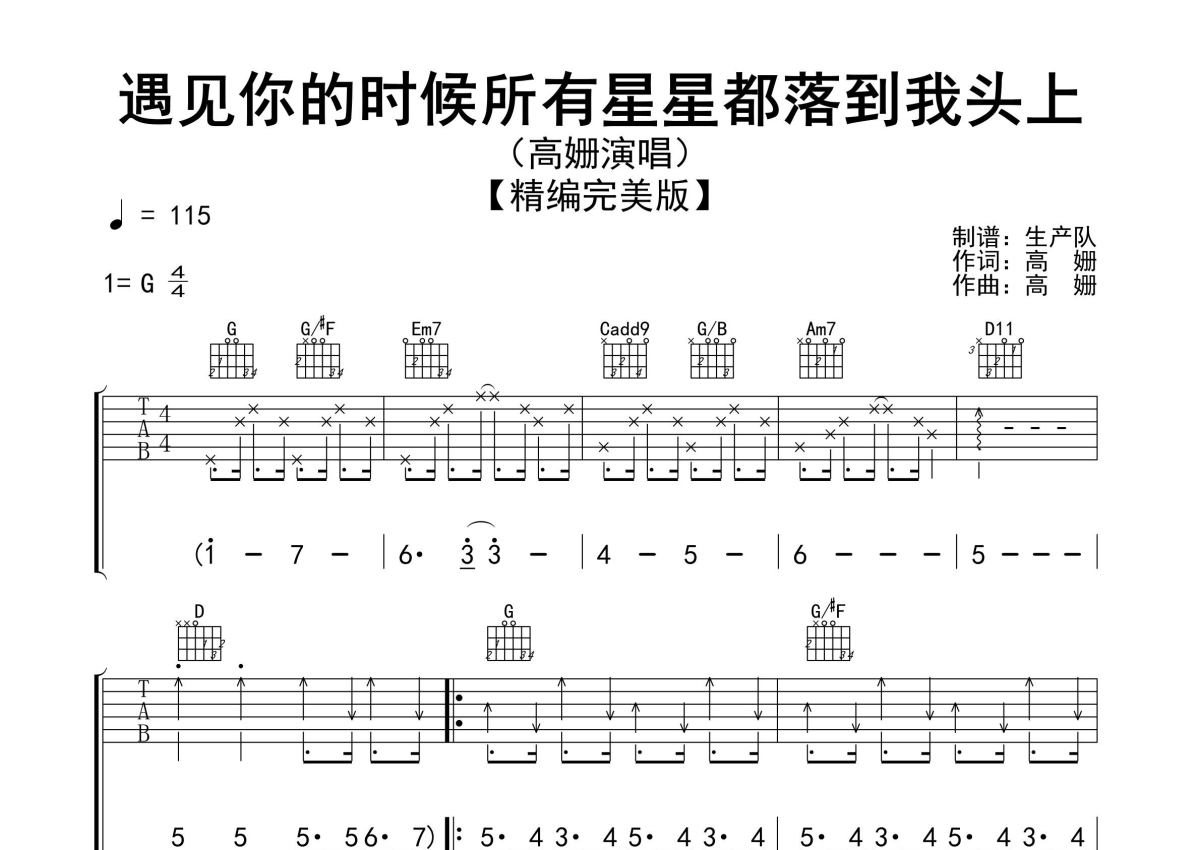 《遇见你的时候所有星星都落到我头上》是高珊演唱的一首歌曲,精编完美版,拍号为4/4拍,歌曲速度为每分钟115拍,歌曲原调为G调,本吉他谱采用的是G调指法编配,演奏时不需要使用变调夹即为原调,这份吉他谱共有四张高清图谱,图谱由 @生产队 编配上传,图谱使用六线谱编配,包含吉他和弦指法、简谱以及歌词部分,使用这份遇见你的时候所有星星都落到我头上吉他谱,可以让你更加方便地掌握这首歌曲的弹唱技巧,快来尝试吧。高姗演唱的歌曲《遇见你的时候所有星星都落到我头上》原版吉他谱,完整的前奏、间奏、尾奏solo编配,一首非常有态度的歌曲,怀旧经典!。