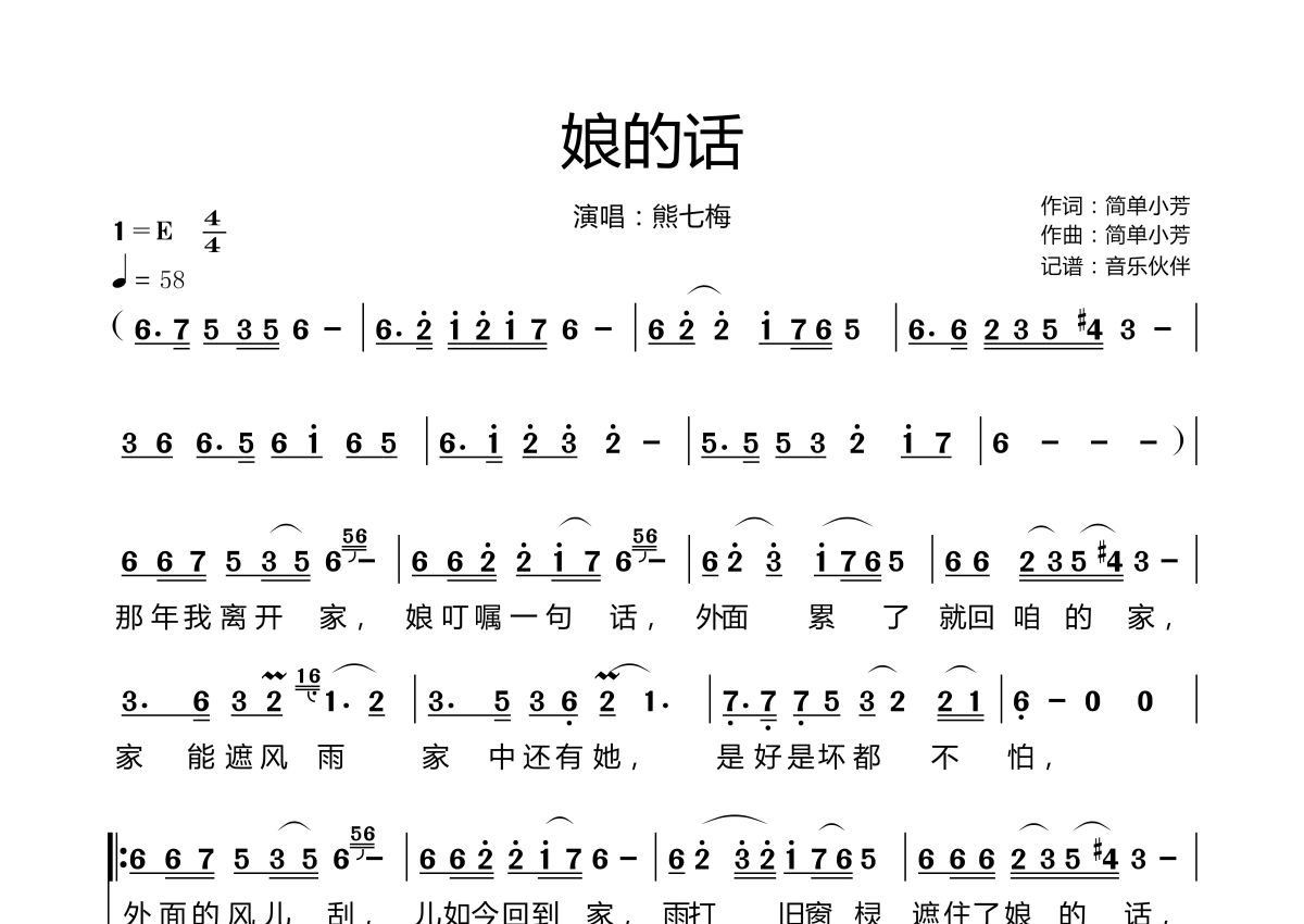《娘的话》是熊七梅演唱的一首歌曲,拍号为4/4拍,歌曲速度为每分钟58拍,这份简谱共有两张高清图谱,图谱由 @音乐伙伴 编配上传。