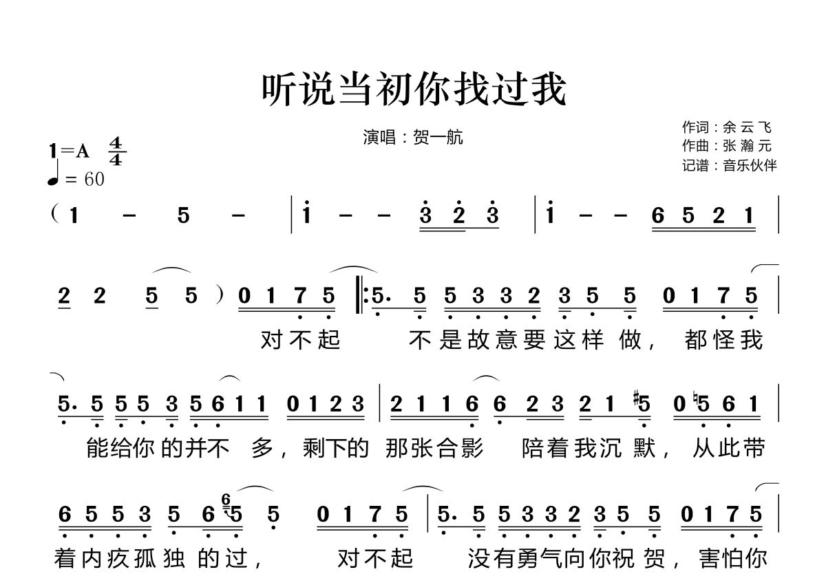 《听说当初你找过我》是贺一航演唱的一首歌曲,这份简谱共有两张高清图谱,图谱由 @音乐伙伴 编配上传。