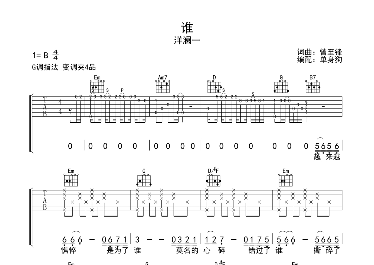 《谁》是洋澜一演唱的一首歌曲,拍号为4/4拍,歌曲原调为B调,但由于原调指法比较难,为了方便弹奏,本吉他谱采用的是G调指法编配,变调夹4品弹奏即为原调,当然也可以根据自己的音域改变变调夹位置,或者通过改变和弦调性,以方便自己弹奏,这份吉他谱共有三张高清图谱,图谱由 @单身狗 编配上传,图谱使用六线谱编配,包含吉他和弦指法、简谱以及歌词部分,使用这份谁吉他谱,可以让你更加方便地掌握这首歌曲的弹唱技巧,快来尝试吧。