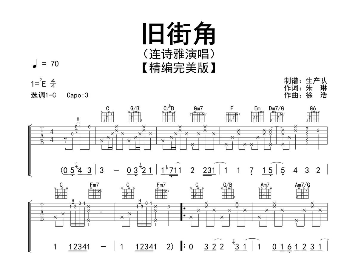 《旧街角》是连诗雅演唱的一首歌曲,精编完美版,拍号为4/4拍,歌曲速度为每分钟70拍,歌曲原调为C调,本吉他谱采用的是C调指法编配,变调夹3品弹奏即为原调,当然也可以根据自己的音域改变变调夹位置,或者通过改变和弦调性,以方便自己弹奏,这份吉他谱共有两张高清图谱,图谱由 @生产队 编配上传,图谱使用六线谱编配,包含吉他和弦指法、简谱以及歌词部分,使用这份旧街角吉他谱,可以让你更加方便地掌握这首歌曲的弹唱技巧,快来尝试吧。连诗雅演唱的歌曲《旧街角》原版吉他谱,精编完美版,一首经典的民谣歌曲,值得推荐!。