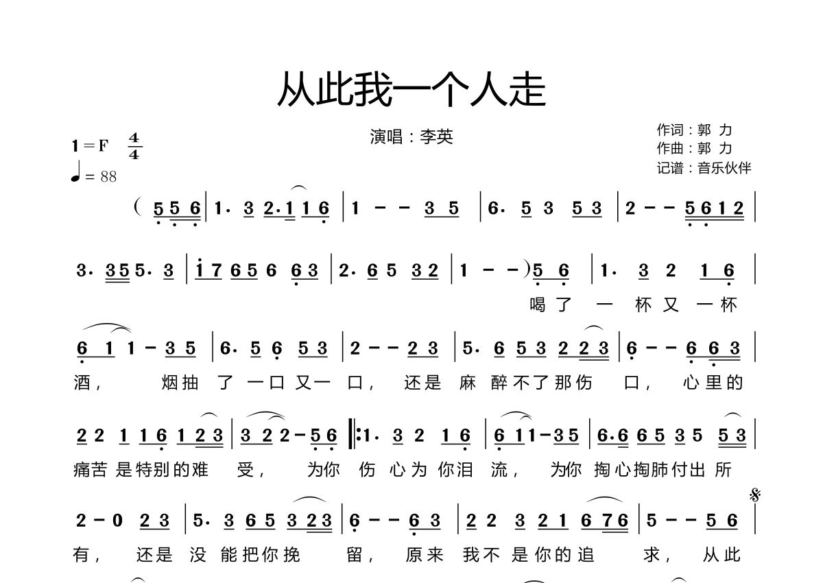 《从此我一个人走》是李英演唱的一首歌曲,拍号为4/4拍,歌曲速度为每分钟88拍,这份简谱共有一张高清图谱,图谱由 @音乐伙伴 编配上传。