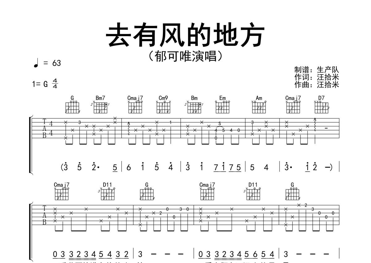 《去有风的地方》是郁可唯演唱的一首歌曲,精编完美版,拍号为4/4拍,歌曲速度为每分钟63拍,歌曲原调为G调,本吉他谱采用的是G调指法编配,演奏时不需要使用变调夹即为原调,这份吉他谱共有三张高清图谱,图谱由 @生产队 编配上传,图谱使用六线谱编配,包含吉他和弦指法、简谱以及歌词部分,使用这份去有风的地方吉他谱,可以让你更加方便地掌握这首歌曲的弹唱技巧,快来尝试吧。郁可唯演唱的歌曲《去有风的地方》原版吉他谱,精编完美版。歌曲也是电视剧《去有风的地方》主题曲,非常动听的一首民谣歌曲,值得推荐!。