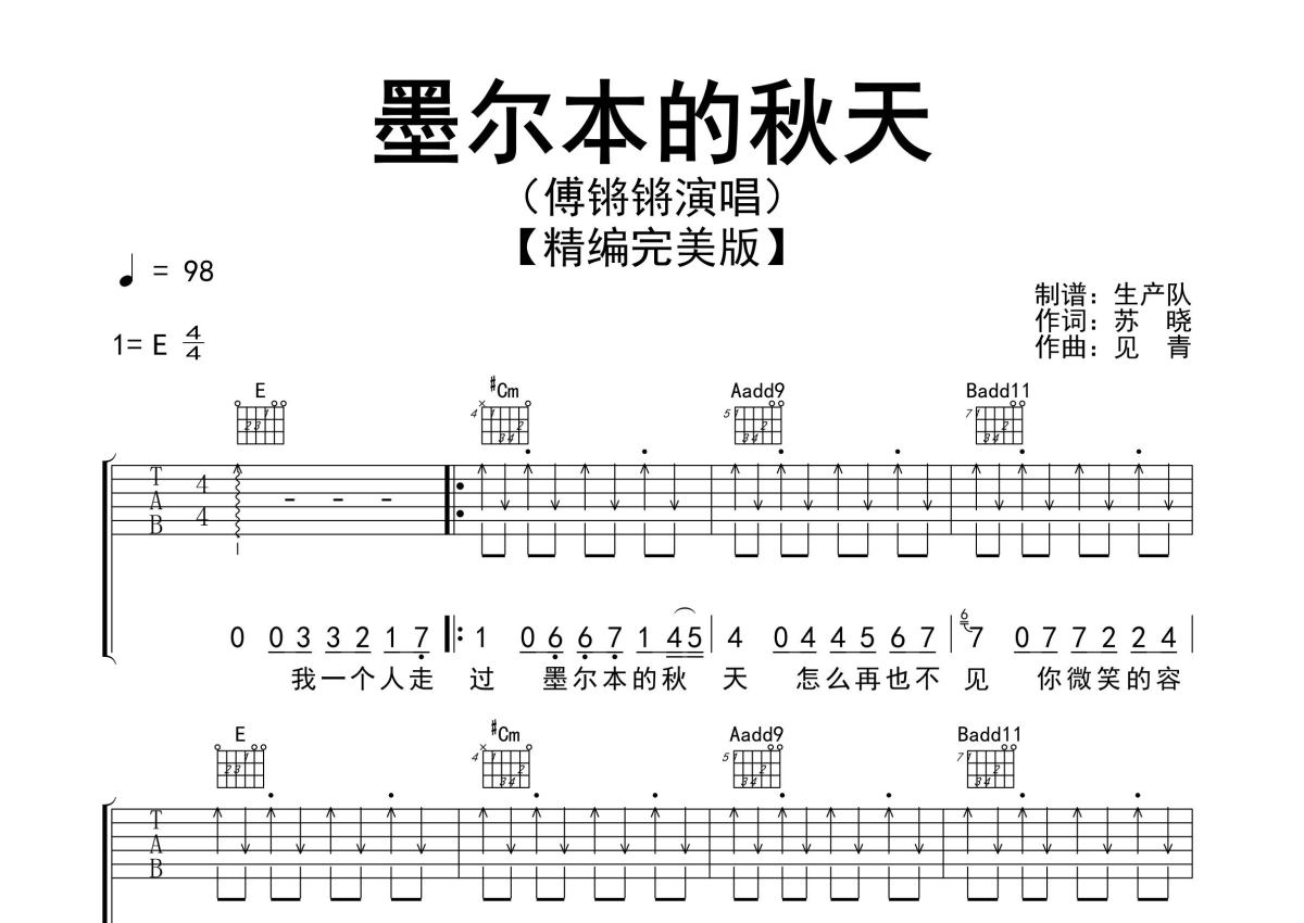 《墨尔本的秋天》是傅锵锵演唱的一首歌曲,精编完美版,拍号为4/4拍,歌曲速度为每分钟98拍,歌曲原调为E调,但由于原调指法比较难,为了方便弹奏,本吉他谱采用的是E调指法编配,演奏时不需要使用变调夹即为原调,这份吉他谱共有三张高清图谱,图谱由 @生产队 编配上传,图谱使用六线谱编配,包含吉他和弦指法、简谱以及歌词部分,使用这份墨尔本的秋天吉他谱,可以让你更加方便地掌握这首歌曲的弹唱技巧,快来尝试吧。傅锵锵演唱的歌曲《墨尔本的秋天》原版吉他谱,精编完美版,值得推荐的一首优秀作品!。
