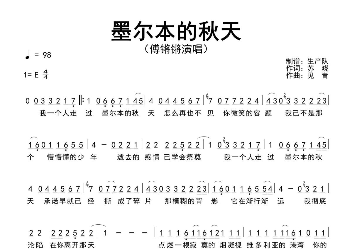 《墨尔本的秋天》是傅锵锵演唱的一首歌曲,原版简谱,拍号为4/4拍,歌曲速度为每分钟98拍,这份简谱共有一张高清图谱,图谱由 @生产队 编配上传傅锵锵演唱的歌曲《墨尔本的秋天》原版简谱。