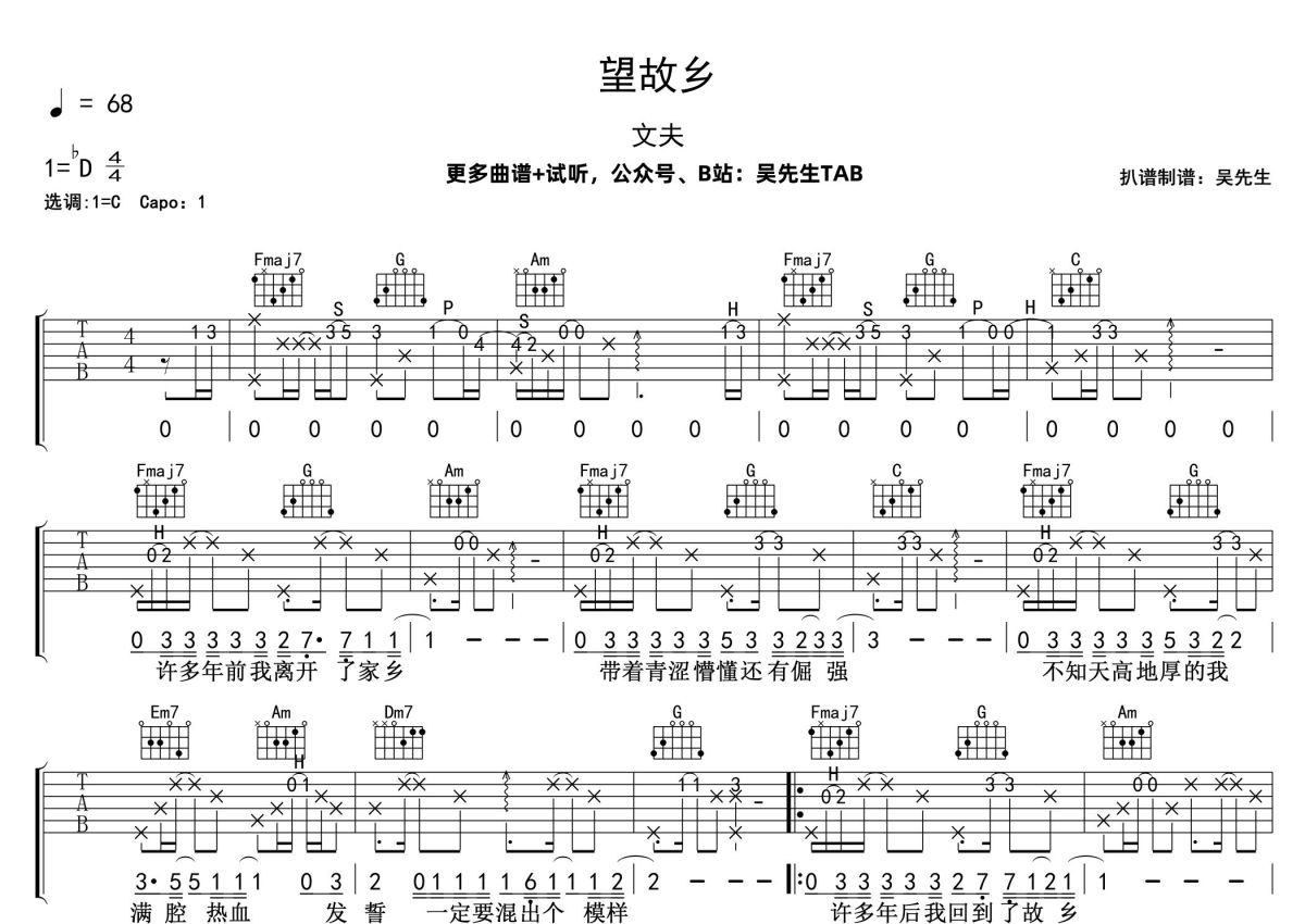 《望故乡》是文夫演唱的一首歌曲,拍号为4/4拍,歌曲速度为每分钟68拍,歌曲原调为Db调,但由于原调指法比较难,为了方便弹奏,本吉他谱采用的是C调指法编配,变调夹1品弹奏即为原调,当然也可以根据自己的音域改变变调夹位置,或者通过改变和弦调性,以方便自己弹奏,这份吉他谱共有三张高清图谱,图谱由 @吴先生TAB 编配上传,图谱使用六线谱编配,包含吉他和弦指法、简谱以及歌词部分,曲谱配备了相关的音频提供试听,使用这份望故乡吉他谱,可以让你更加方便地掌握这首歌曲的弹唱技巧,快来尝试吧。
