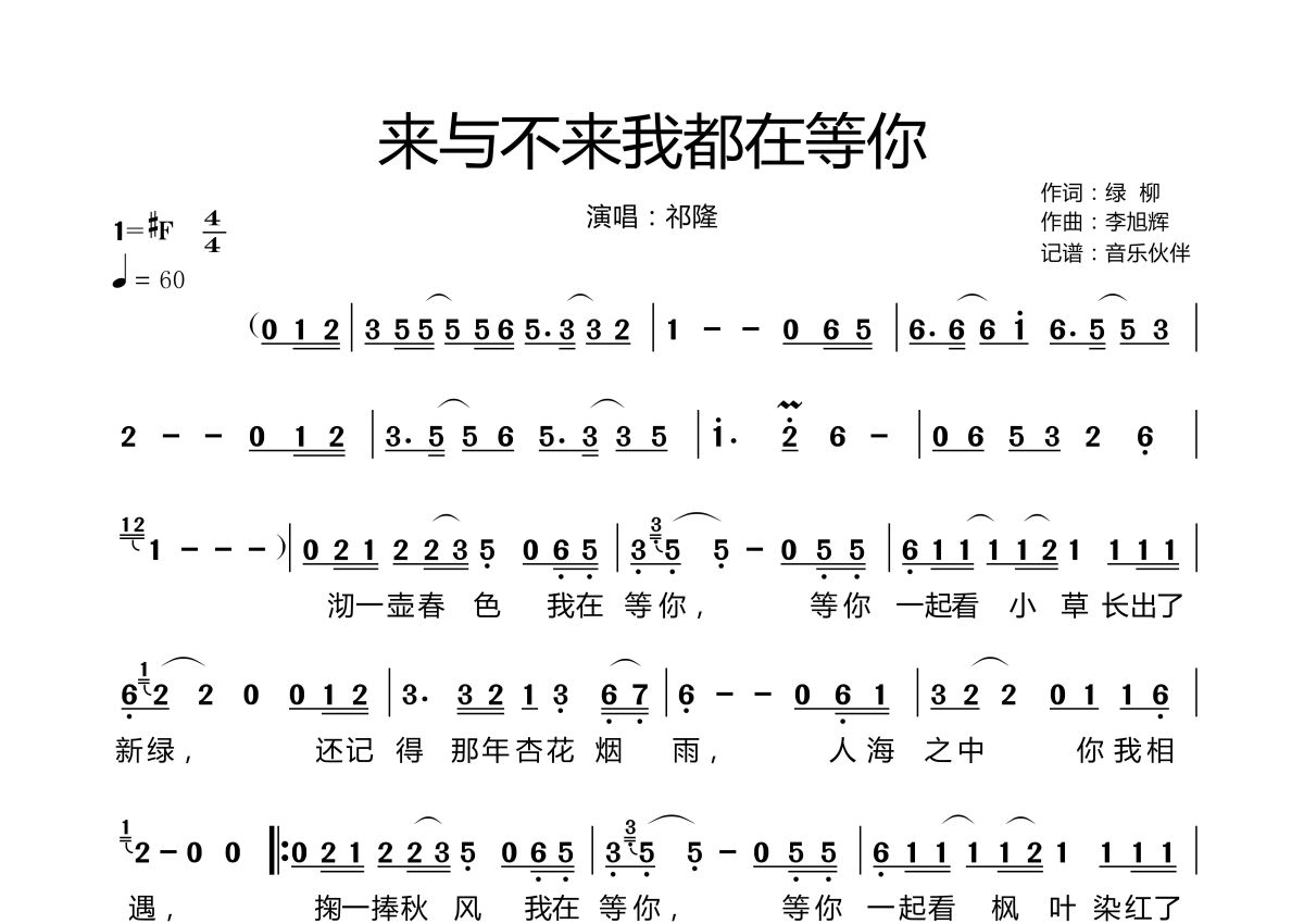 《来与不来我都在等你》是祁隆演唱的一首歌曲,拍号为4/4拍,歌曲速度为每分钟60拍,这份简谱共有两张高清图谱,图谱由 @音乐伙伴 编配上传。