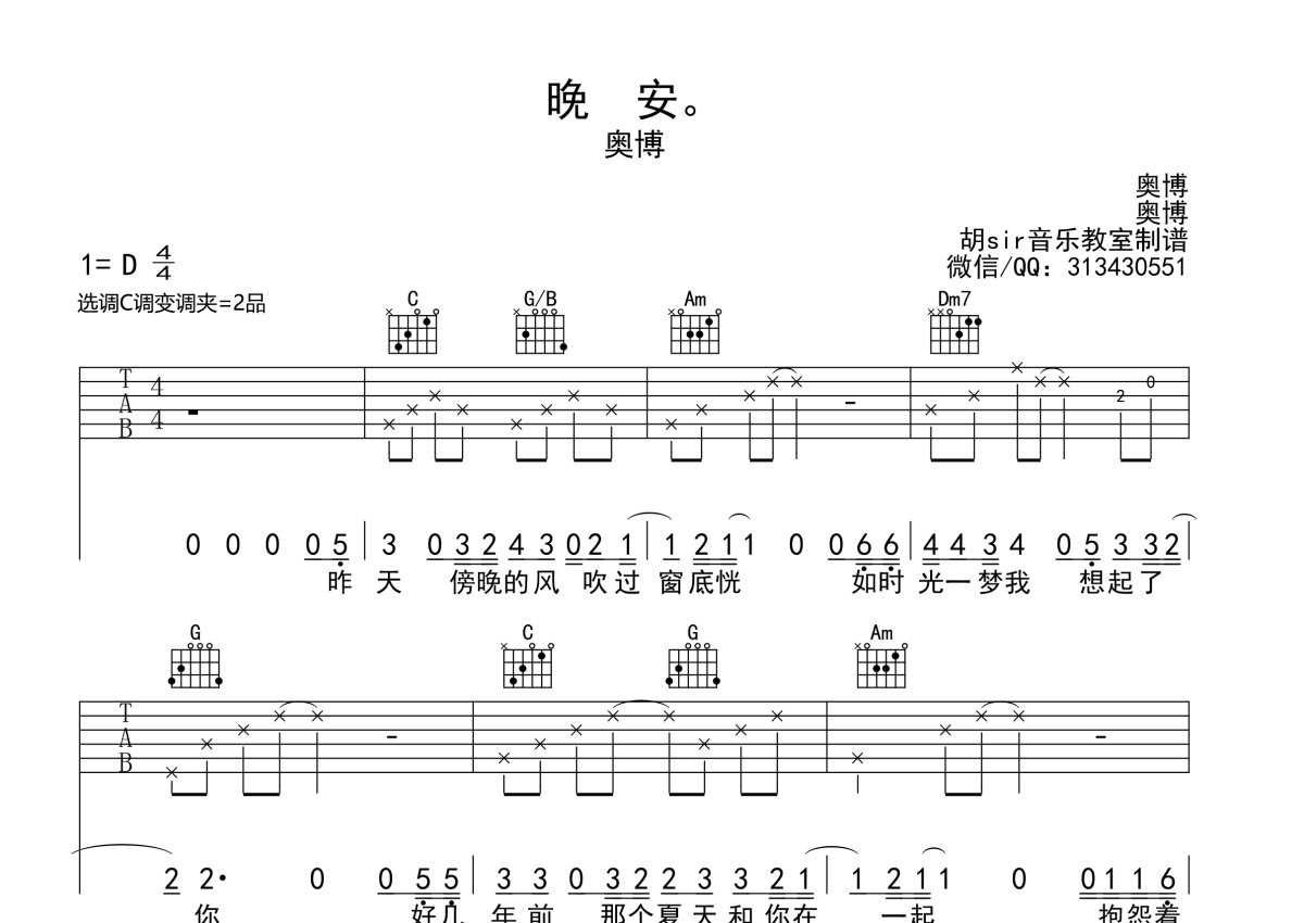 《晚安》是奥博演唱的一首歌曲,本吉他谱采用的是C调指法编配,这份吉他谱共有四张高清图谱,图谱由 @胡sir音乐 编配上传,图谱使用六线谱编配,包含吉他和弦指法、简谱以及歌词部分,使用这份晚安吉他谱,可以让你更加方便地掌握这首歌曲的弹唱技巧,快来尝试吧。