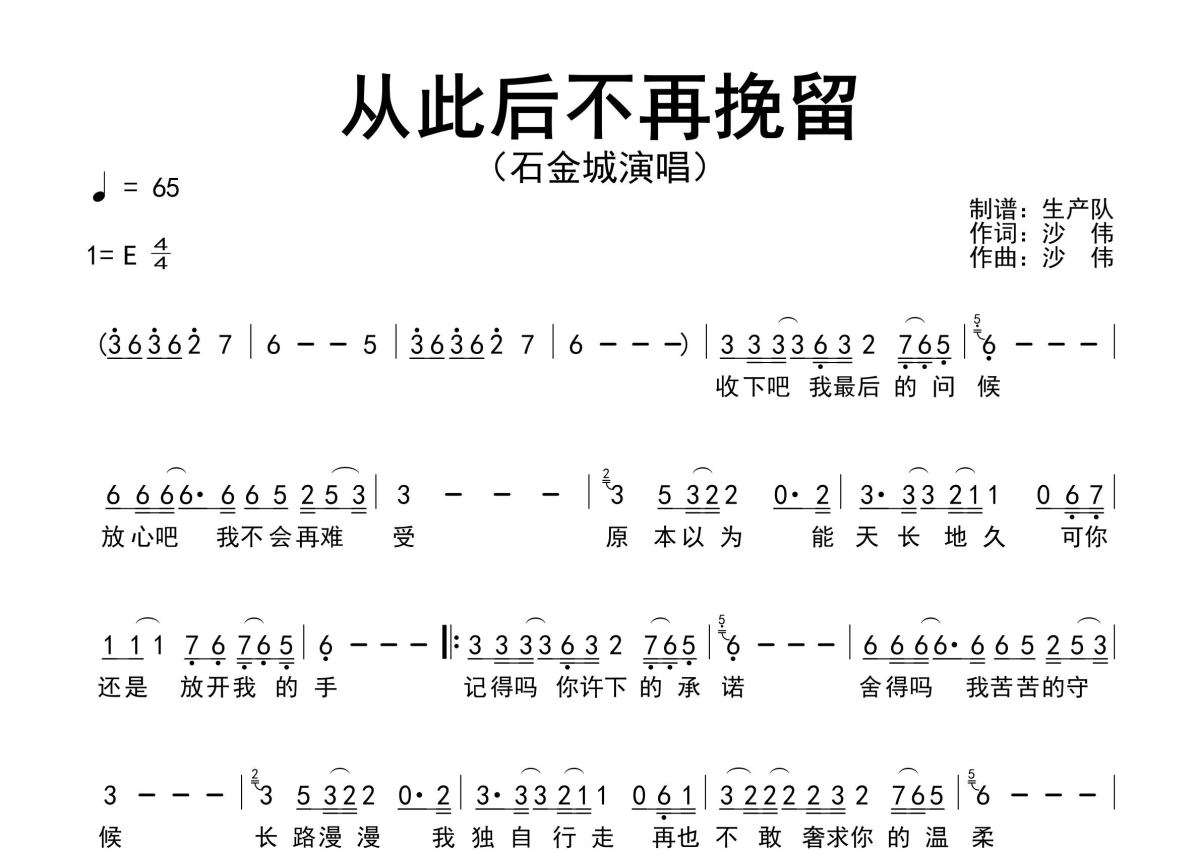 《从此后不再挽留》是石金城演唱的一首歌曲,原版简谱,拍号为4/4拍,歌曲速度为每分钟65拍,这份简谱共有一张高清图谱,图谱由 @生产队 编配上传石金城演唱的歌曲《从此后不再挽留》原版简谱,完整的前奏、间奏、尾奏solo编配。