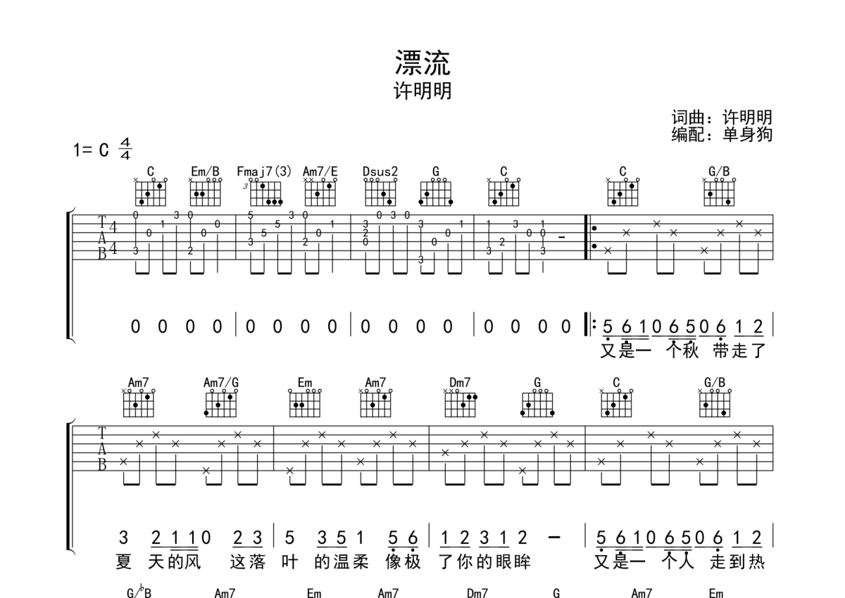 漂流吉他谱 - 许明明演唱 - C调弹唱六线谱