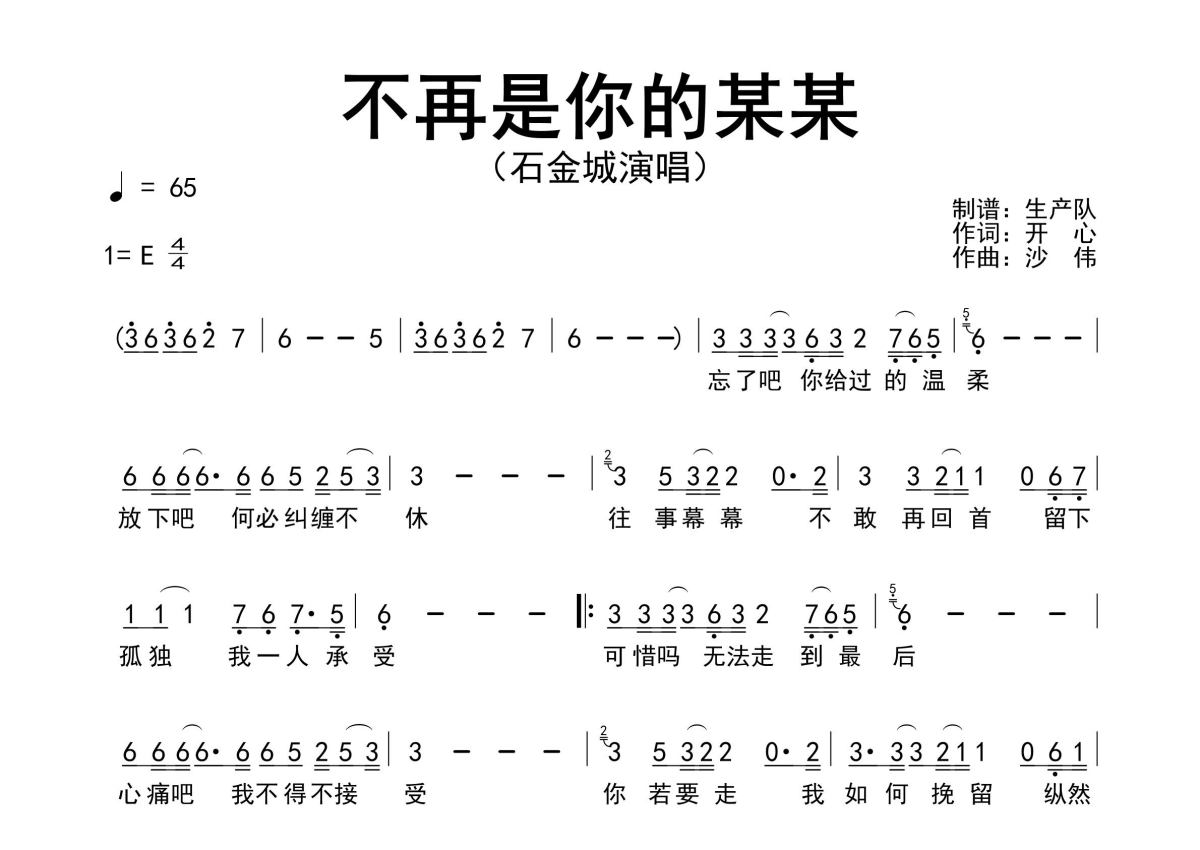 《不再是你的某某》是石金城演唱的一首歌曲,原版简谱,拍号为4/4拍,歌曲速度为每分钟65拍,这份简谱共有一张高清图谱,图谱由 @生产队 编配上传石金城演唱的歌曲《不再是你的某某》原版简谱,完整的前奏、间奏、尾奏solo编配。