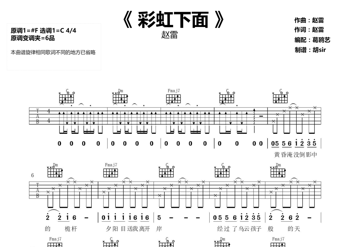 《彩虹下面》是赵雷演唱的一首歌曲,本吉他谱采用的是C调指法编配,这份吉他谱共有三张高清图谱,图谱由 @胡sir音乐 编配上传,图谱使用六线谱编配,包含吉他和弦指法、简谱以及歌词部分,使用这份彩虹下面吉他谱,可以让你更加方便地掌握这首歌曲的弹唱技巧,快来尝试吧。彩虹下面吉他谱,赵雷演唱的一首新歌,电影《西虹市首富》推广曲,原调升F,选调C,变调夹夹第六品。歌声温暖质朴,欢快的吉他和口琴的悠扬旋律,带我们回到记忆中最美好纯粹的故乡。那里的云朵有着孩子般的脸,热情的人儿把篝火点燃,那里有娇艳的花开满山间,优美的歌声就在彩虹的下面。
