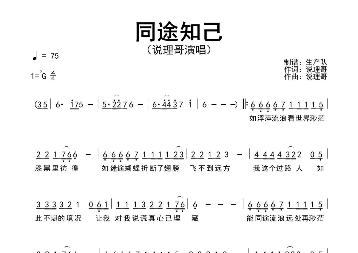 《同途知己》是说理哥演唱的一首歌曲,原版简谱,拍号为4/4拍,歌曲速度为每分钟75拍,这份简谱共有一张高清图谱,图谱由 @生产队 编配上传说理哥作词、作曲并演唱的歌曲《同途知己》原版简谱,完整的前奏、间奏solo编配,值得推荐的一首粤语歌曲!。