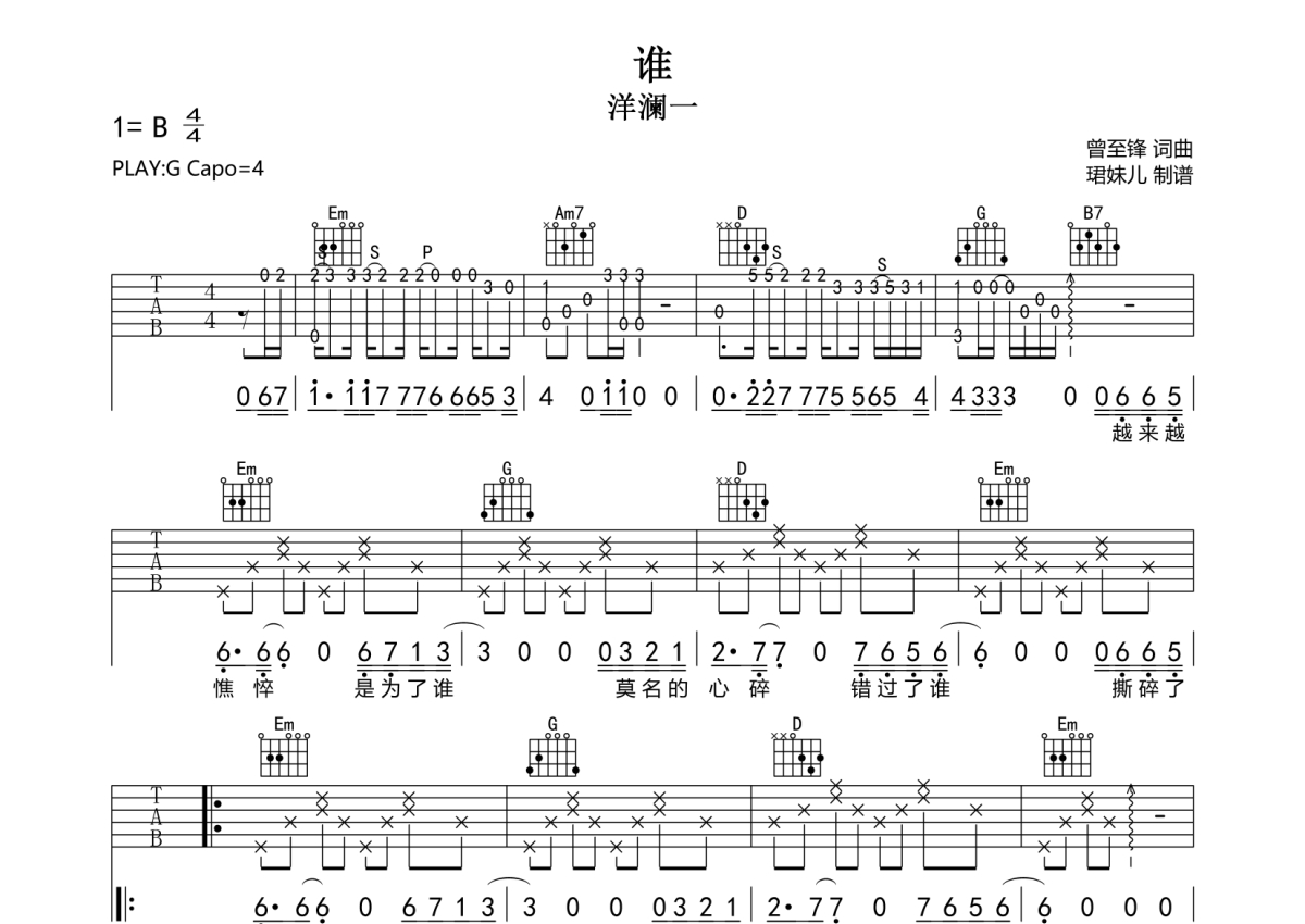《谁》吉他谱 - 洋澜一 - G调弹唱六线谱