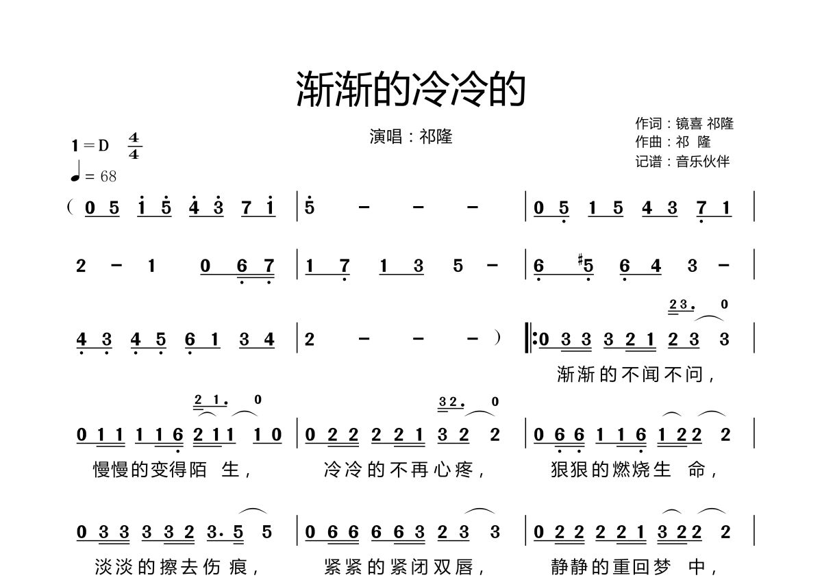 《渐渐的冷冷的》是祁隆演唱的一首歌曲,拍号为4/4拍,歌曲速度为每分钟68拍,这份简谱共有两张高清图谱,图谱由 @音乐伙伴 编配上传。