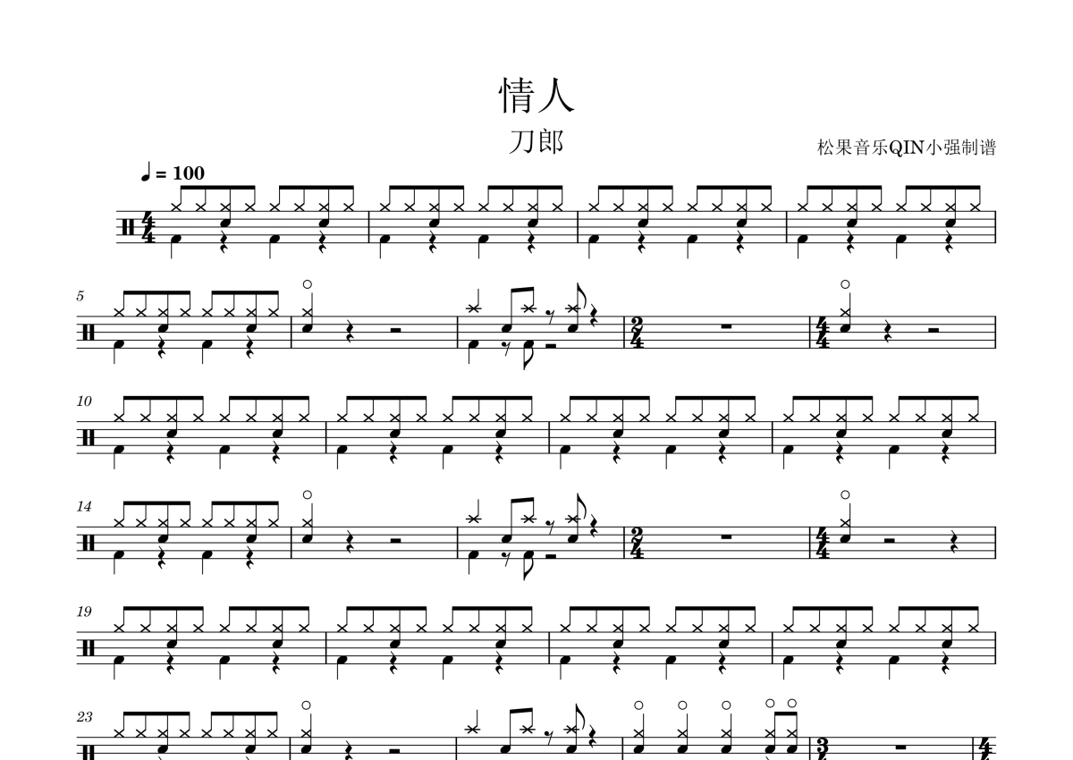 《情人》是刀郎演唱的一首歌曲,拍号为4/4拍,这份架子鼓谱共有两张高清图谱,图谱由 @松果音乐QIN小强 编配上传,图谱使用五线谱编配,使用这份情人架子鼓谱,你将能够轻松地敲打出这首刀郎的情人,快来尝试吧。《情人》是由刀郎作词、作曲并演唱的歌曲,收录于刀郎2004年1月6日发行的录音室专辑《2002年的第一场雪》中。 2005年12月2日,该曲入围TVB8金曲榜颁奖典礼最佳作词。