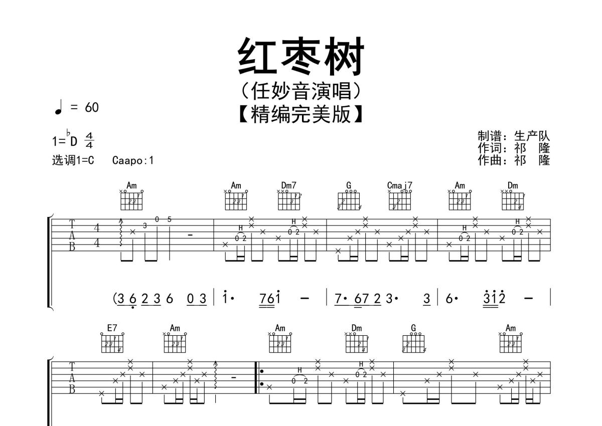 《红枣树》是任妙音演唱的一首歌曲,精编完美版,拍号为4/4拍,歌曲速度为每分钟60拍,歌曲原调为Db调,但由于原调指法比较难,为了方便弹奏,本吉他谱采用的是C调指法编配,变调夹1品弹奏即为原调,当然也可以根据自己的音域改变变调夹位置,或者通过改变和弦调性,以方便自己弹奏,这份吉他谱共有三张高清图谱,图谱由 @生产队 编配上传,图谱使用六线谱编配,包含吉他和弦指法、简谱以及歌词部分,使用这份红枣树吉他谱,可以让你更加方便地掌握这首歌曲的弹唱技巧,快来尝试吧。任妙音演唱的歌曲《红枣树》原版吉他谱,精准的前奏、间奏solo编配,精编完美版,一首动听的歌曲值得推荐!。