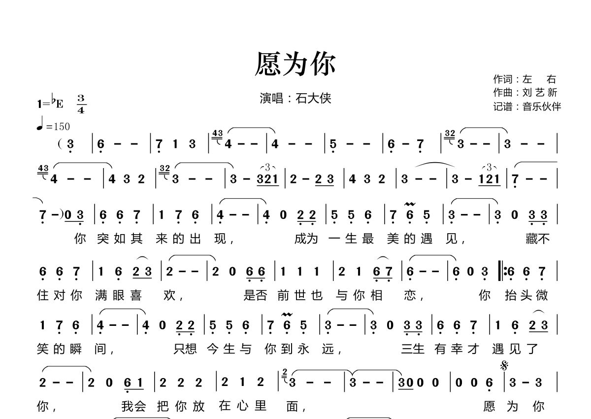 《愿为你》是石大侠演唱的一首歌曲,这份简谱共有一张高清图谱,图谱由 @音乐伙伴 编配上传。