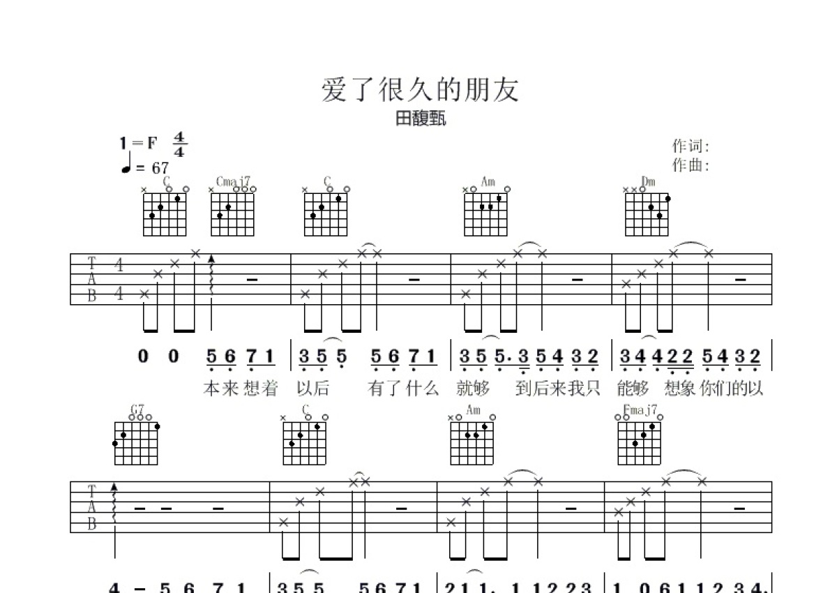《后来的我们》是田馥甄演唱的一首歌曲,本吉他谱采用的是C调指法编配,这份吉他谱共有两张高清图谱,图谱由 @胡sir音乐 编配上传,图谱使用六线谱编配,包含吉他和弦指法、简谱以及歌词部分,曲谱配备了相关的视频提供浏览,使用这份后来的我们吉他谱,可以让你更加方便地掌握这首歌曲的弹唱技巧,快来尝试吧。爱了很久的朋友吉他谱,田馥甄演唱一首简单而深情的歌曲,电影《后来的我们》插曲,Hebe的演唱从来不会叫人失望,一字一句道出了爱情错过后的种种模样,听着这首歌,你想到了谁呢,你又敢不敢 @你那位「爱了很久的朋友」?