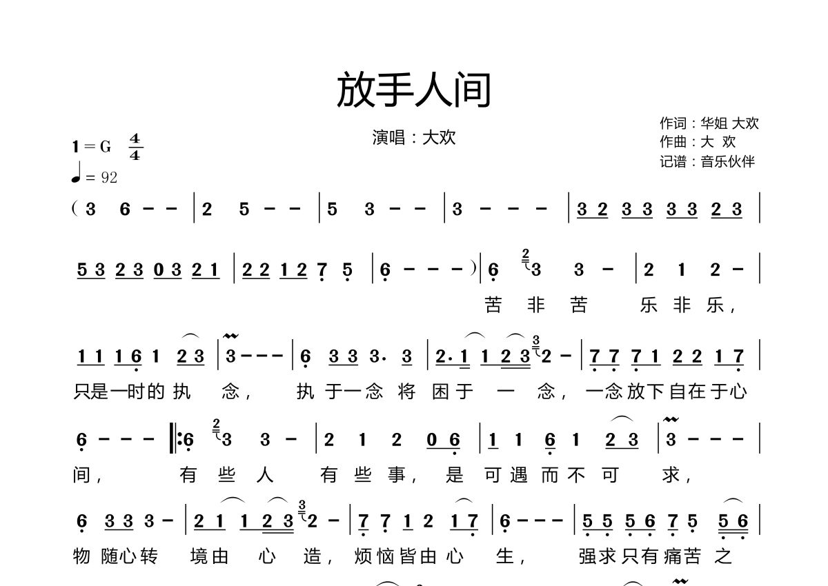 《放手人间》是大欢演唱的一首歌曲,拍号为4/4拍,歌曲速度为每分钟92拍,这份简谱共有一张高清图谱,图谱由 @音乐伙伴 编配上传。