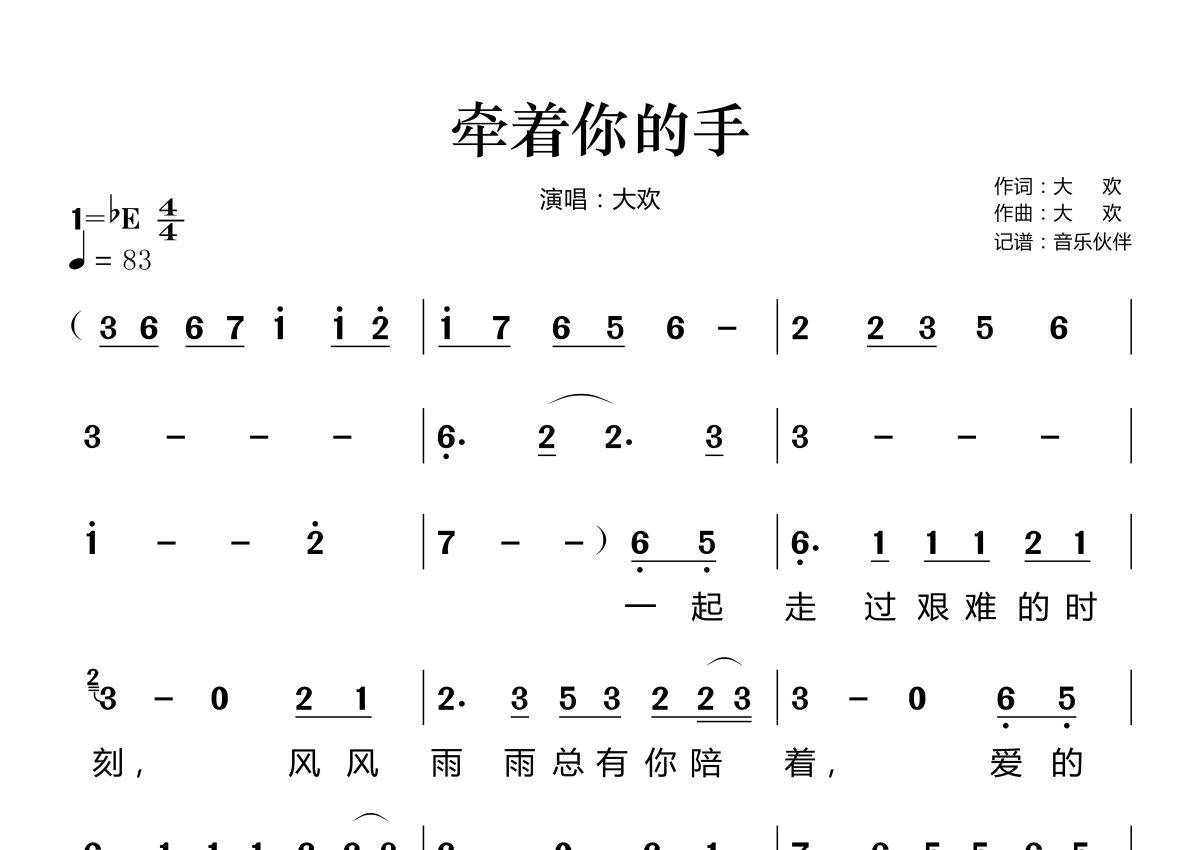 牵着你的手简谱 - 大欢演唱