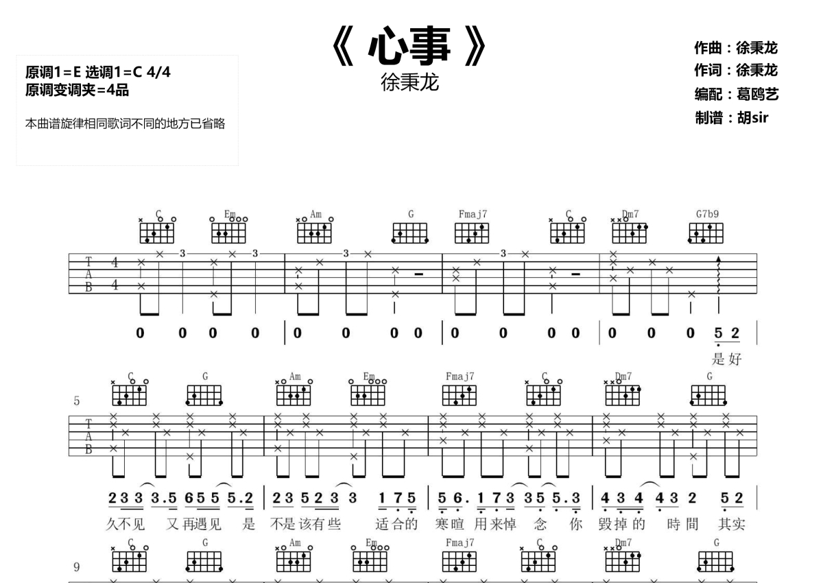《心事》是徐秉龙演唱的一首歌曲,本吉他谱采用的是C调指法编配,这份吉他谱共有一张高清图谱,图谱由 @胡sir音乐 编配上传,图谱使用六线谱编配,包含吉他和弦指法、简谱以及歌词部分,使用这份心事吉他谱,可以让你更加方便地掌握这首歌曲的弹唱技巧,快来尝试吧。心事吉他谱,徐秉龙演唱的一首歌曲原创歌曲。《心事》六线谱,高清弹唱图片谱,原调E,选用C,原调变调夹4品,唱来深情款款,苦涩的浪漫,喜欢你,是不安,是轻叹,是皱眉,是红了眼眶,是满满的心事,后来放弃你是我最深的勇敢。喜欢成一个人真难。