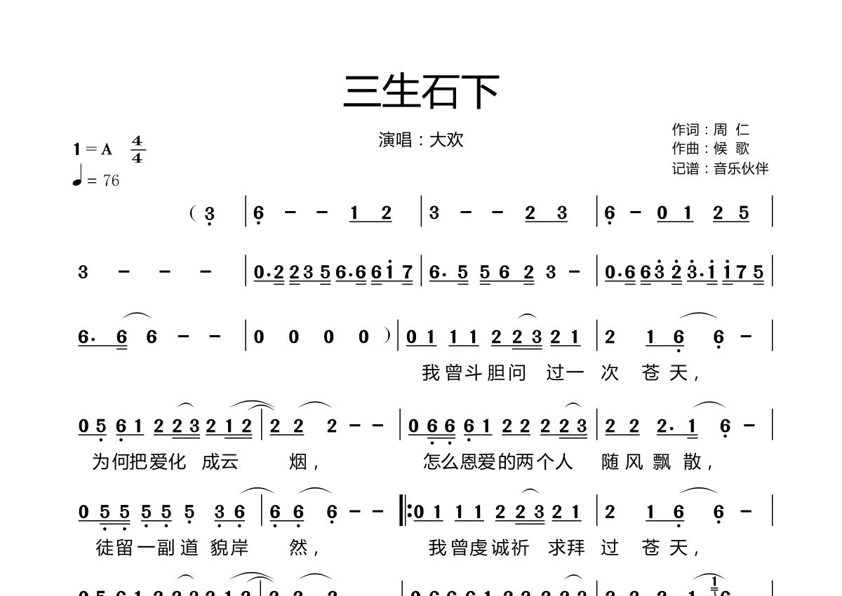 《三生石下》是大欢演唱的一首歌曲,拍号为4/4拍,歌曲速度为每分钟76拍,这份简谱共有两张高清图谱,图谱由 @音乐伙伴 编配上传。