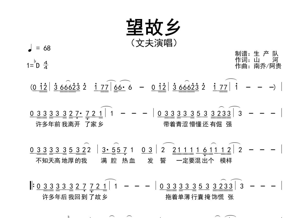 《望故乡》是文夫演唱的一首歌曲,原版简谱,拍号为4/4拍,歌曲速度为每分钟68拍,这份简谱共有一张高清图谱,图谱由 @生产队 编配上传文夫演唱的歌曲《望故乡》原版简谱,精准的前奏、间奏、尾奏solo编配,精编完美版,值得推荐的一首热门歌曲!。