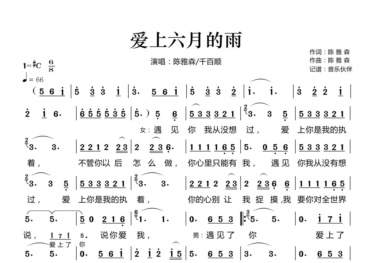 爱上六月的雨简谱 - 陈雅森/千百顺演唱