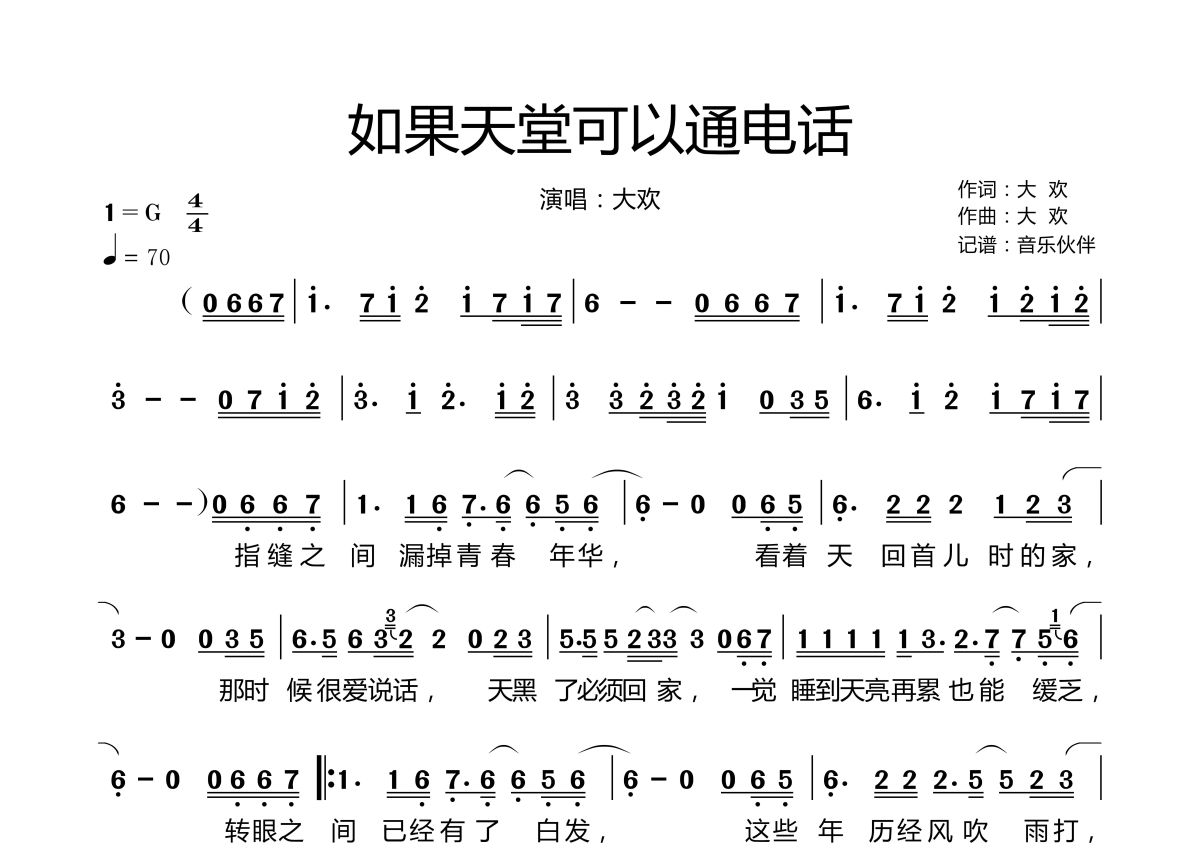 如果天堂可以通电话简谱 - 大欢演唱