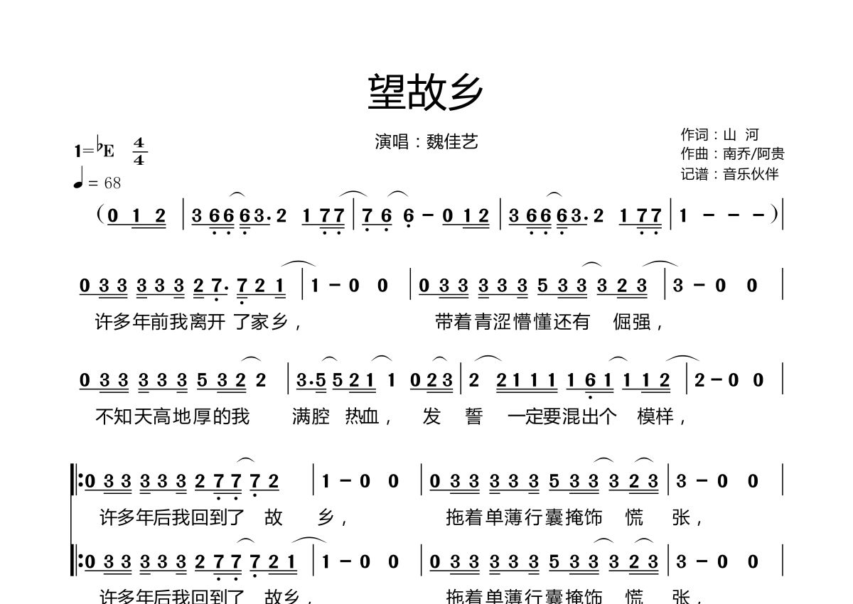 望故乡简谱 - 魏佳艺演唱