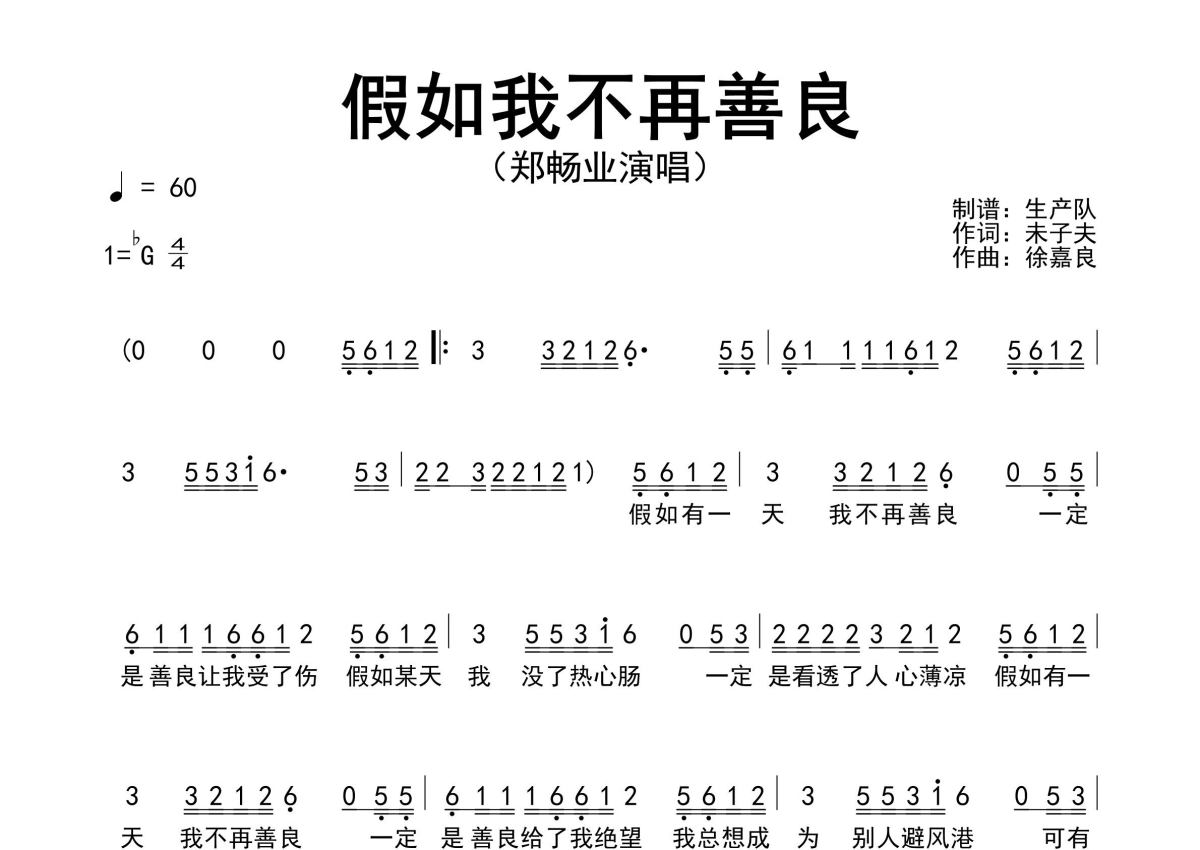《假如我不再善良》是郑畅业演唱的一首歌曲,原版简谱,拍号为4/4拍,歌曲速度为每分钟60拍,这份简谱共有一张高清图谱,图谱由 @生产队 编配上传郑畅业演唱的歌曲《假如我不再善良》原版简谱,完整的前奏、间奏、尾奏solo编配。