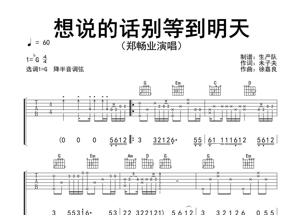 《想说的话别等到明天》是郑畅业演唱的一首歌曲,精编完美版,拍号为4/4拍,歌曲速度为每分钟60拍,歌曲原调为Gb调,但由于原调指法比较难,为了方便弹奏,本吉他谱采用的是G调指法编配,降半音调弦弹奏即为原调,当然也可以根据自己的音域决定是否调弦,这份吉他谱共有两张高清图谱,图谱由 @生产队 编配上传,图谱使用六线谱编配,包含吉他和弦指法、简谱以及歌词部分,使用这份想说的话别等到明天吉他谱,可以让你更加方便地掌握这首歌曲的弹唱技巧,快来尝试吧。郑畅业演唱的歌曲《想说的话别等到明天》原版吉他谱,完整的前奏、间奏、尾奏solo编配。