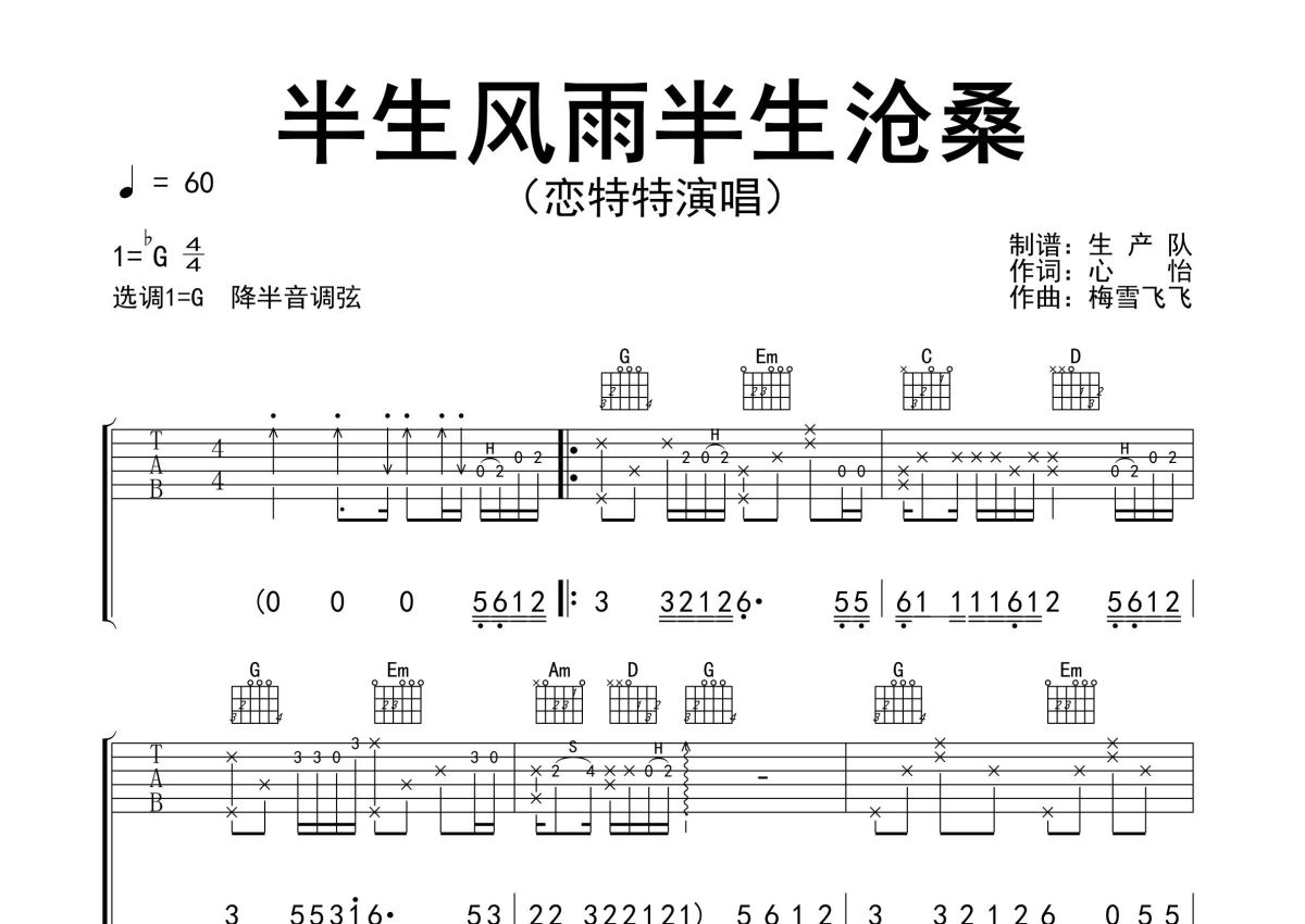 《半生风雨半生沧桑》是恋特特演唱的一首歌曲,精编完美版,拍号为4/4拍,歌曲速度为每分钟60拍,歌曲原调为Gb调,但由于原调指法比较难,为了方便弹奏,本吉他谱采用的是G调指法编配,降半音调弦弹奏即为原调,当然也可以根据自己的音域决定是否调弦,这份吉他谱共有两张高清图谱,图谱由 @生产队 编配上传,图谱使用六线谱编配,包含吉他和弦指法、简谱以及歌词部分,使用这份半生风雨半生沧桑吉他谱,可以让你更加方便地掌握这首歌曲的弹唱技巧,快来尝试吧。恋特特演唱的歌曲《半生风雨半生沧桑》原版吉他谱,完整的前奏、间奏、尾奏solo编配。