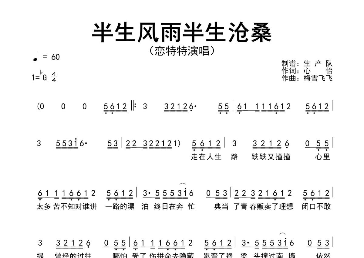 《半生风雨半生沧桑》是恋特特演唱的一首歌曲,原版简谱,拍号为4/4拍,歌曲速度为每分钟60拍,这份简谱共有一张高清图谱,图谱由 @生产队 编配上传恋特特演唱的歌曲《半生风雨半生沧桑》原版简谱,完整的前奏、间奏、尾奏solo编配。