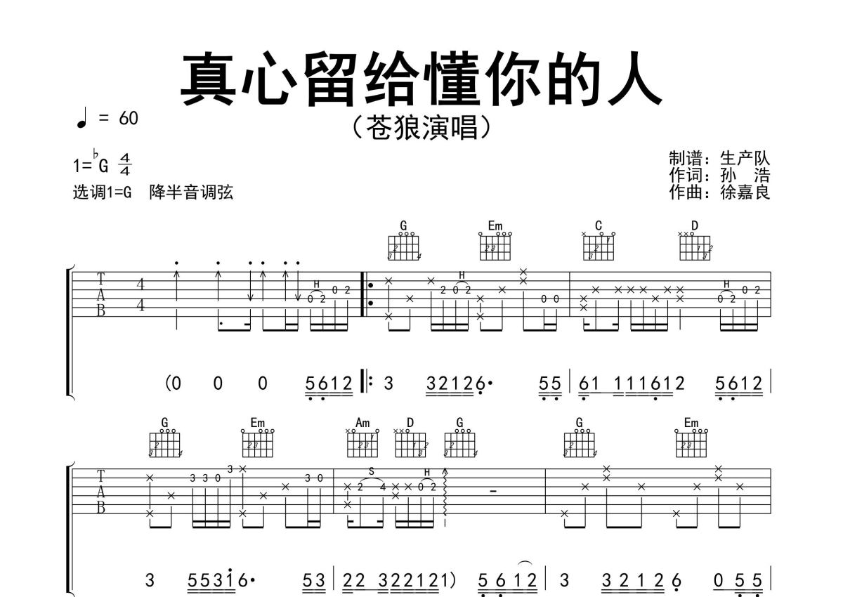 《真心留给懂你的人》是苍狼演唱的一首歌曲,精编完美版,拍号为4/4拍,歌曲速度为每分钟60拍,歌曲原调为Gb调,但由于原调指法比较难,为了方便弹奏,本吉他谱采用的是G调指法编配,降半音调弦弹奏即为原调,当然也可以根据自己的音域决定是否调弦,这份吉他谱共有两张高清图谱,图谱由 @生产队 编配上传,图谱使用六线谱编配,包含吉他和弦指法、简谱以及歌词部分,使用这份真心留给懂你的人吉他谱,可以让你更加方便地掌握这首歌曲的弹唱技巧,快来尝试吧。苍狼演唱的歌曲《真心留给懂你的人》原版吉他谱,完整的前奏、间奏、尾奏solo编配。