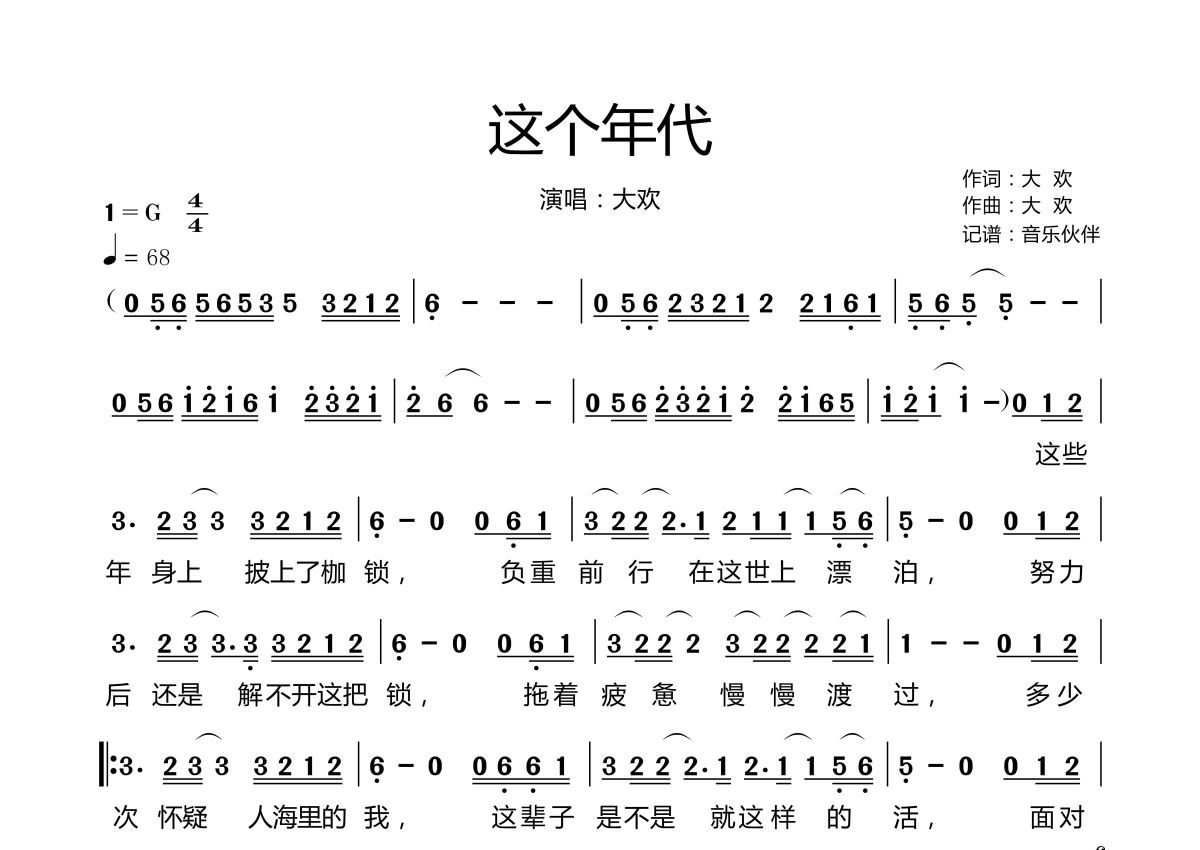《这个年代》是大欢演唱的一首歌曲,拍号为4/4拍,歌曲速度为每分钟68拍,这份简谱共有两张高清图谱,图谱由 @音乐伙伴 编配上传。