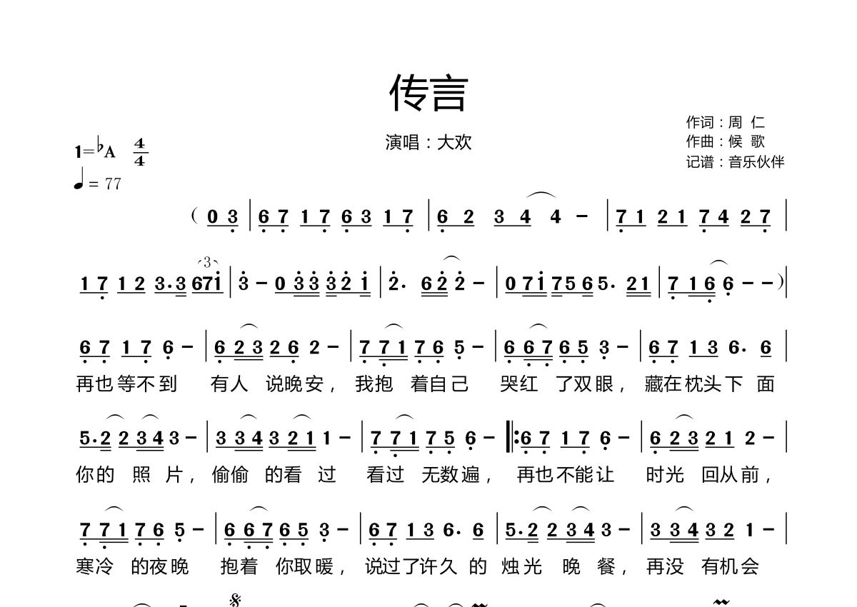 《传言》是大欢演唱的一首歌曲,拍号为4/4拍,歌曲速度为每分钟77拍,这份简谱共有一张高清图谱,图谱由 @音乐伙伴 编配上传。
