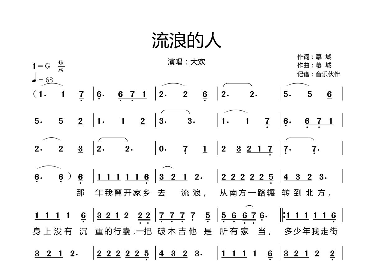 《流浪的人》是大欢演唱的一首歌曲,拍号为6/8拍,歌曲速度为每分钟68拍,这份简谱共有两张高清图谱,图谱由 @音乐伙伴 编配上传。