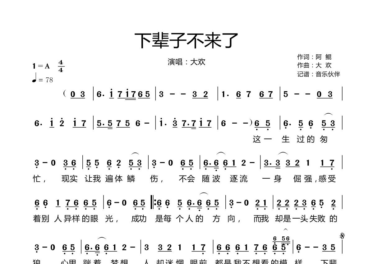 《下辈子不来了》是大欢演唱的一首歌曲,拍号为4/4拍,歌曲速度为每分钟78拍,这份简谱共有一张高清图谱,图谱由 @音乐伙伴 编配上传。