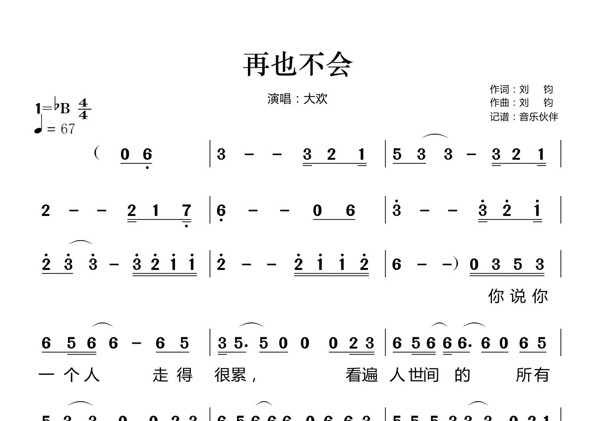 再也不会简谱 - 大欢演唱