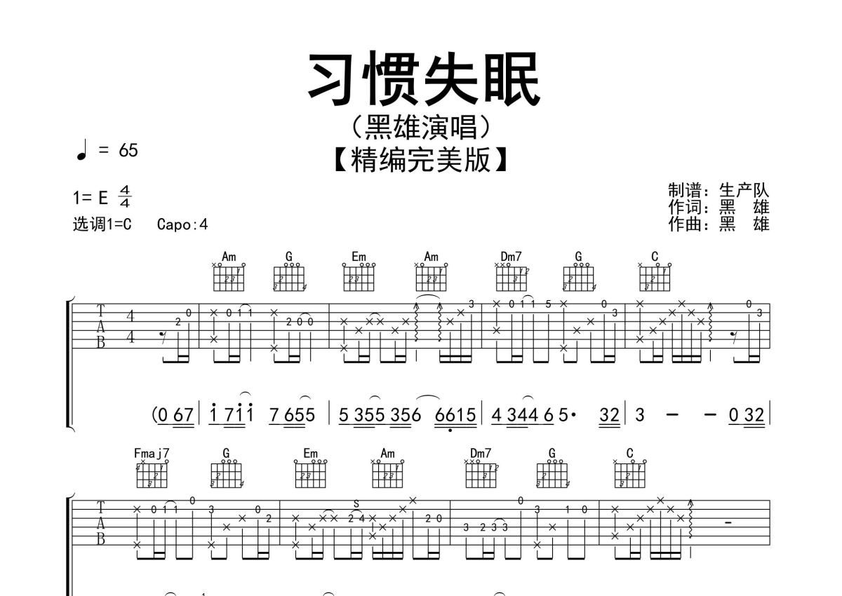 《习惯失眠》是黑雄演唱的一首歌曲,精编完美版,拍号为4/4拍,歌曲速度为每分钟65拍,歌曲原调为E调,但由于原调指法比较难,为了方便弹奏,本吉他谱采用的是C调指法编配,变调夹4品弹奏即为原调,当然也可以根据自己的音域改变变调夹位置,或者通过改变和弦调性,以方便自己弹奏,这份吉他谱共有三张高清图谱,图谱由 @生产队 编配上传,图谱使用六线谱编配,包含吉他和弦指法、简谱以及歌词部分,使用这份习惯失眠吉他谱,可以让你更加方便地掌握这首歌曲的弹唱技巧,快来尝试吧。黑雄作词、作曲并演唱的歌曲《习惯失眠》原版吉他谱,完整的前奏、间奏solo编配,精编完美版,值得推荐的一首经典粤语歌曲!。