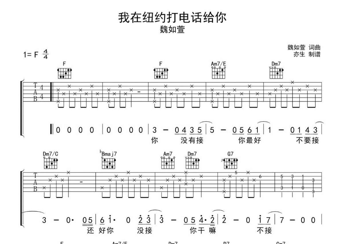我在纽约打电话给你吉他谱 - 魏如萱演唱 - F调弹唱六线谱