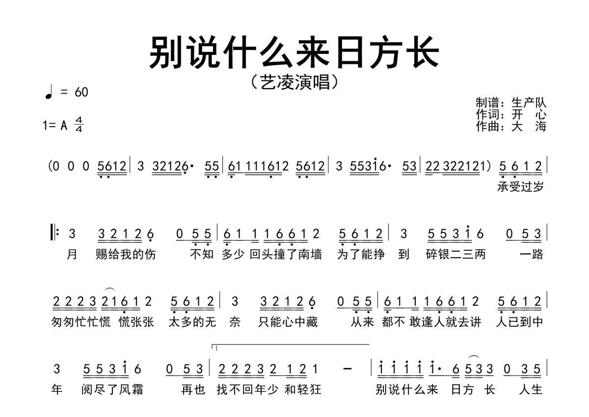 《别说什么来日方长》是艺凌演唱的一首歌曲,原版简谱,拍号为4/4拍,歌曲速度为每分钟60拍,这份简谱共有一张高清图谱,图谱由 @生产队 编配上传艺凌演唱的歌曲《别说什么来日方长》原版简谱,完整的前奏、间奏、尾奏solo编配。