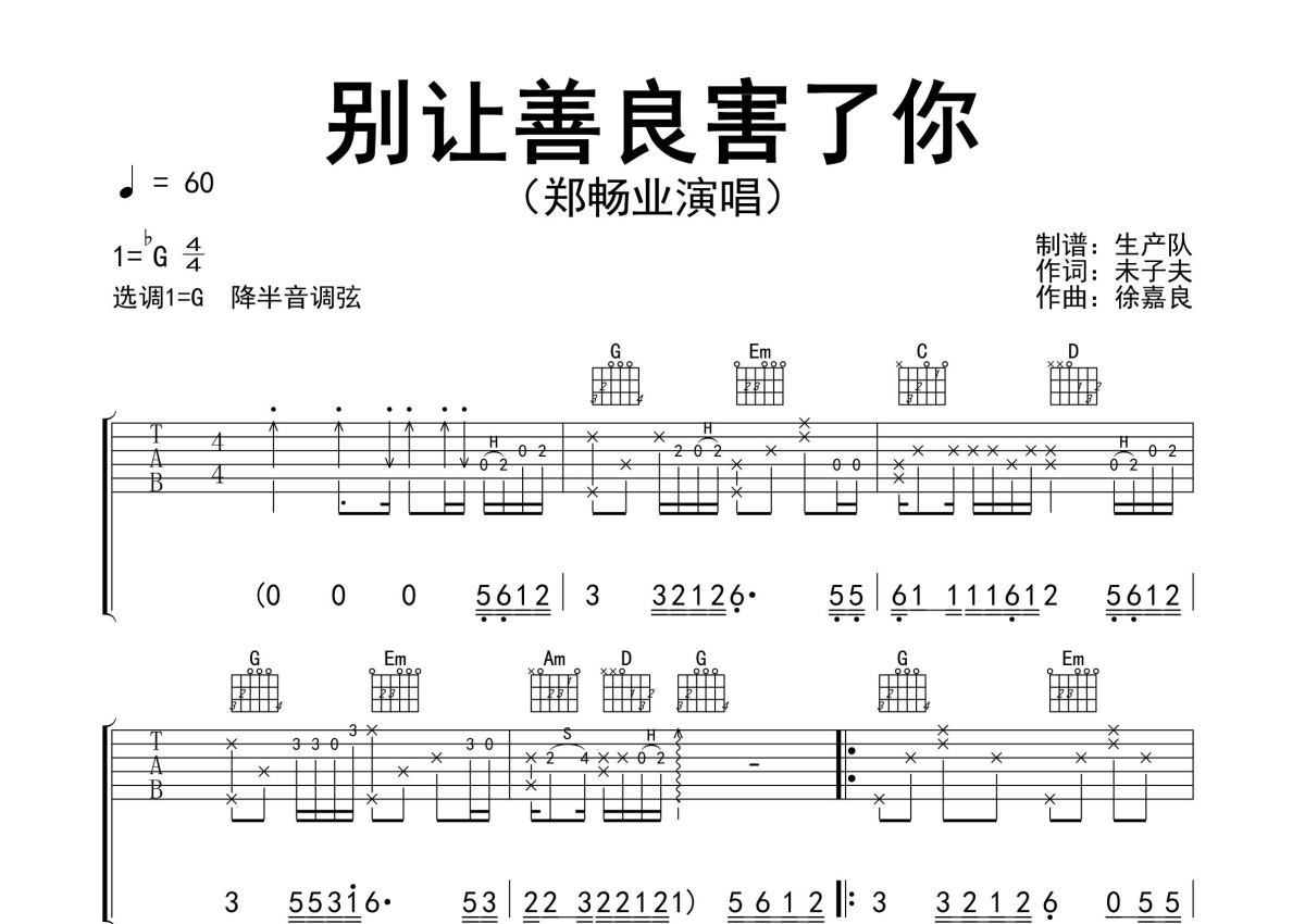 《别让善良害了你》是郑畅业演唱的一首歌曲,精编完美版,拍号为4/4拍,歌曲速度为每分钟60拍,歌曲原调为Gb调,但由于原调指法比较难,为了方便弹奏,本吉他谱采用的是G调指法编配,降半音调弦弹奏即为原调,当然也可以根据自己的音域决定是否调弦,这份吉他谱共有三张高清图谱,图谱由 @生产队 编配上传,图谱使用六线谱编配,包含吉他和弦指法、简谱以及歌词部分,使用这份别让善良害了你吉他谱,可以让你更加方便地掌握这首歌曲的弹唱技巧,快来尝试吧。郑畅业演唱的歌曲《别让善良害了你》原版吉他谱,完整的前奏、间奏、尾奏solo编配。