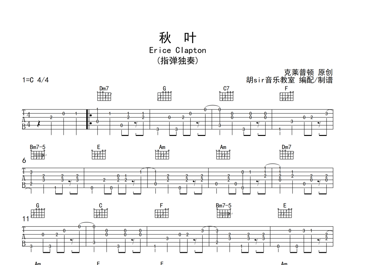 Erice Clapton《秋叶》吉他谱 - C调独奏六线谱