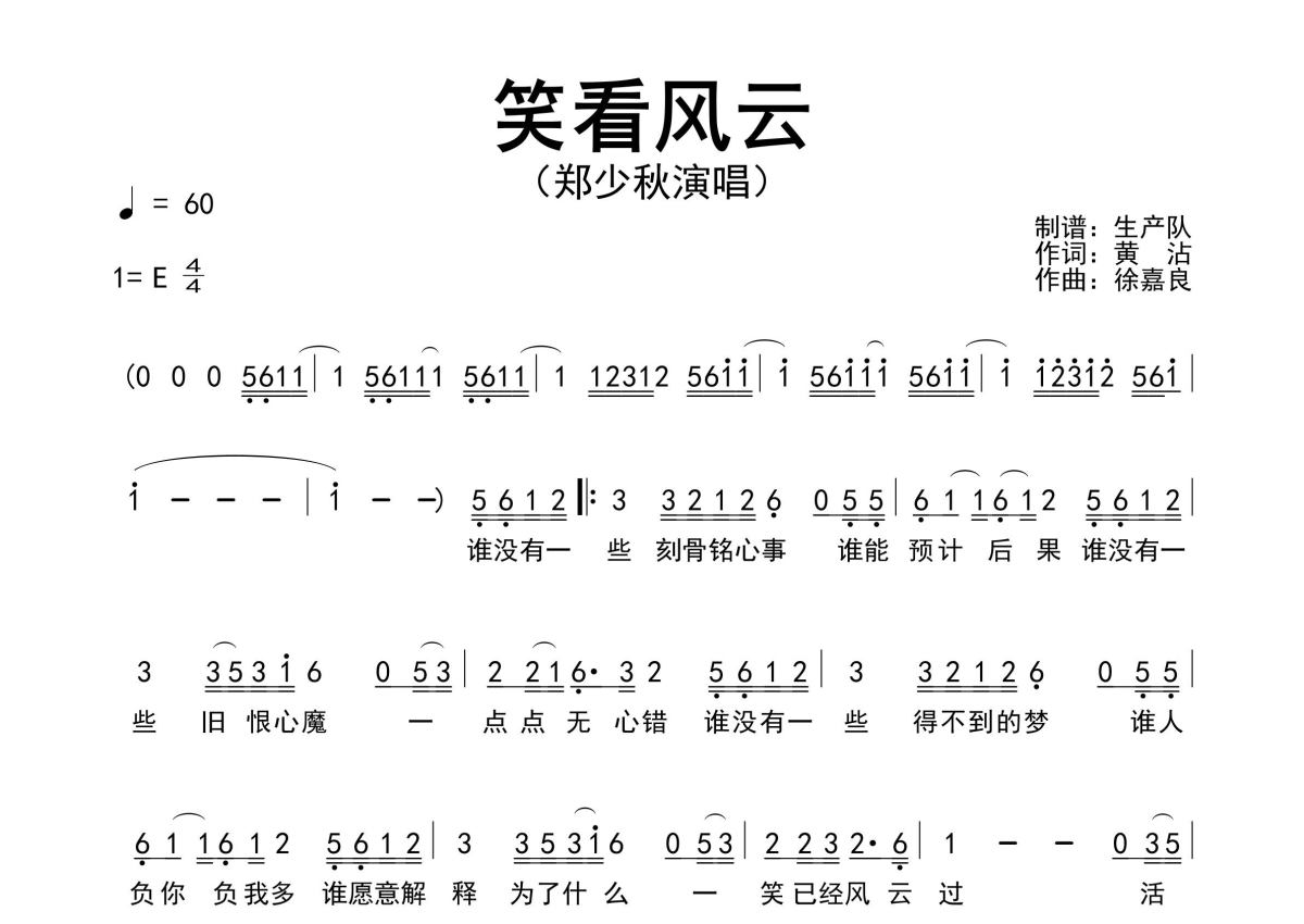 《笑看风云》是郑少秋演唱的一首歌曲,原版简谱,拍号为4/4拍,歌曲速度为每分钟60拍,这份简谱共有一张高清图谱,图谱由 @生产队 编配上传郑少秋演唱的经典歌曲《笑看风云》原版简谱,完整的前奏、间奏、尾奏solo编配,精编完美版,怀旧经典!。