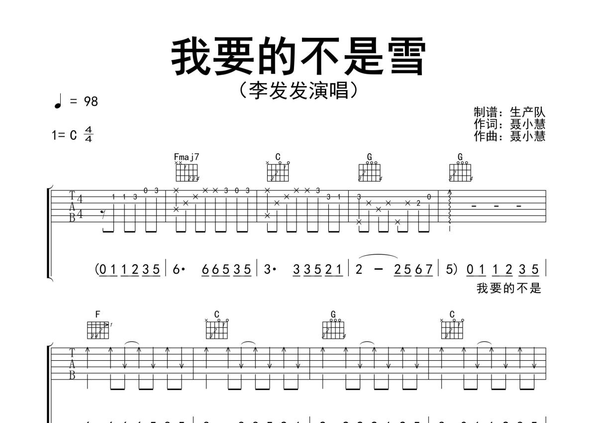 《我要的不是雪》是李发发演唱的一首歌曲,精编完美版,拍号为4/4拍,歌曲速度为每分钟98拍,歌曲原调为C调,本吉他谱采用的是C调指法编配,演奏时不需要使用变调夹即为原调,这份吉他谱共有三张高清图谱,图谱由 @生产队 编配上传,图谱使用六线谱编配,包含吉他和弦指法、简谱以及歌词部分,使用这份我要的不是雪吉他谱,可以让你更加方便地掌握这首歌曲的弹唱技巧,快来尝试吧。李发发演唱的歌曲《我要的不是雪》原版吉他谱,完整的前奏、间奏、尾奏solo编配,精编完美版,值得推荐!。